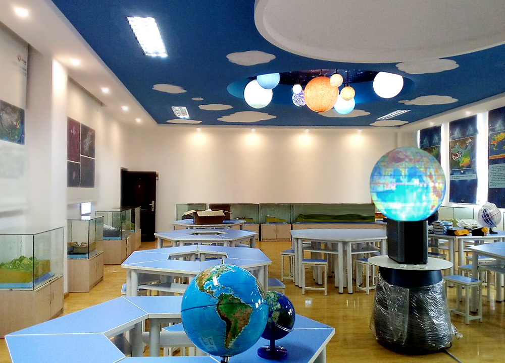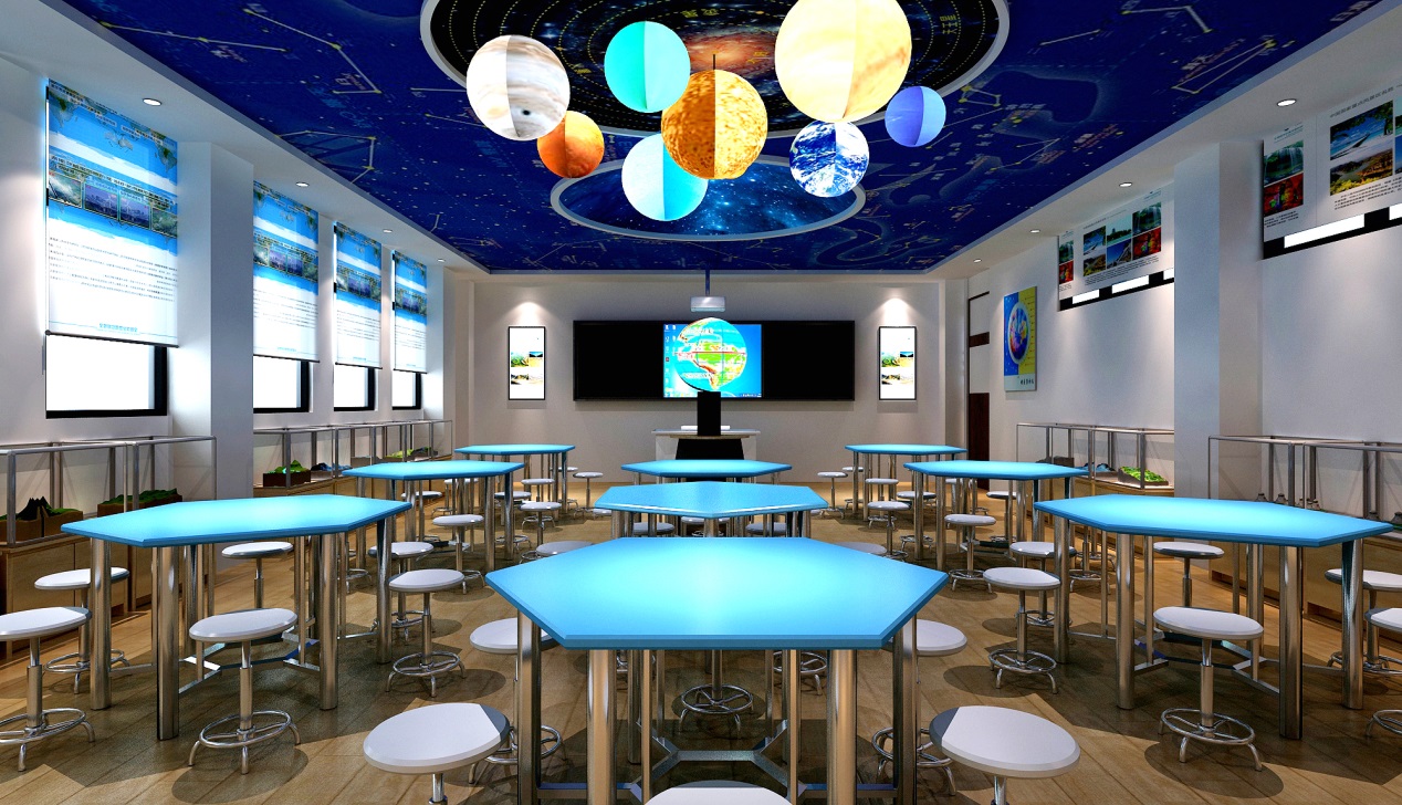 該教室占地102.25平方米,風(fēng)格上依然延續(xù)藍(lán)白風(fēng),設(shè)計(jì)簡約又充滿科技感。與以往專用地理教室相比,教室吊頂層不僅有宇宙星空演示用的天文穹頂,還增加了懸掛式立體太陽系星球,在燈光的襯托下仿佛置身于其中,宇宙的無窮奧秘等著你去探索,這種情境式的教學(xué)環(huán)境能夠使學(xué)生快速進(jìn)入學(xué)習(xí)地理的狀態(tài),提高課堂效率。