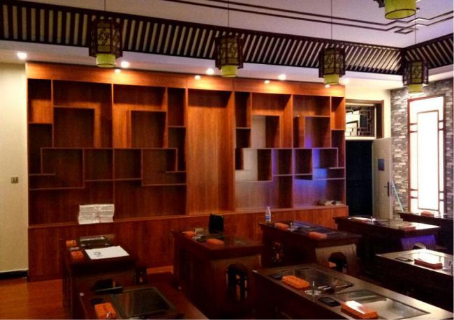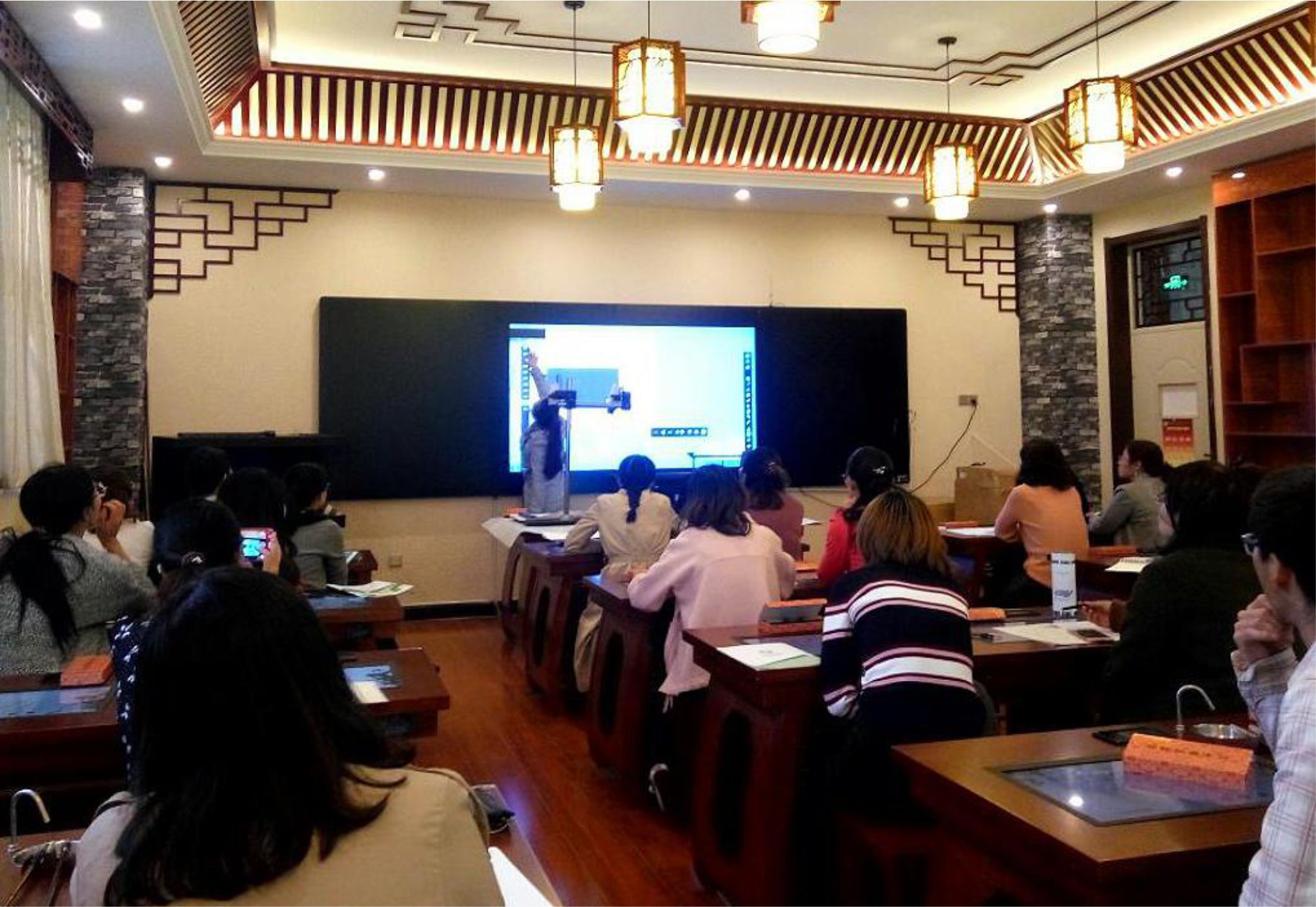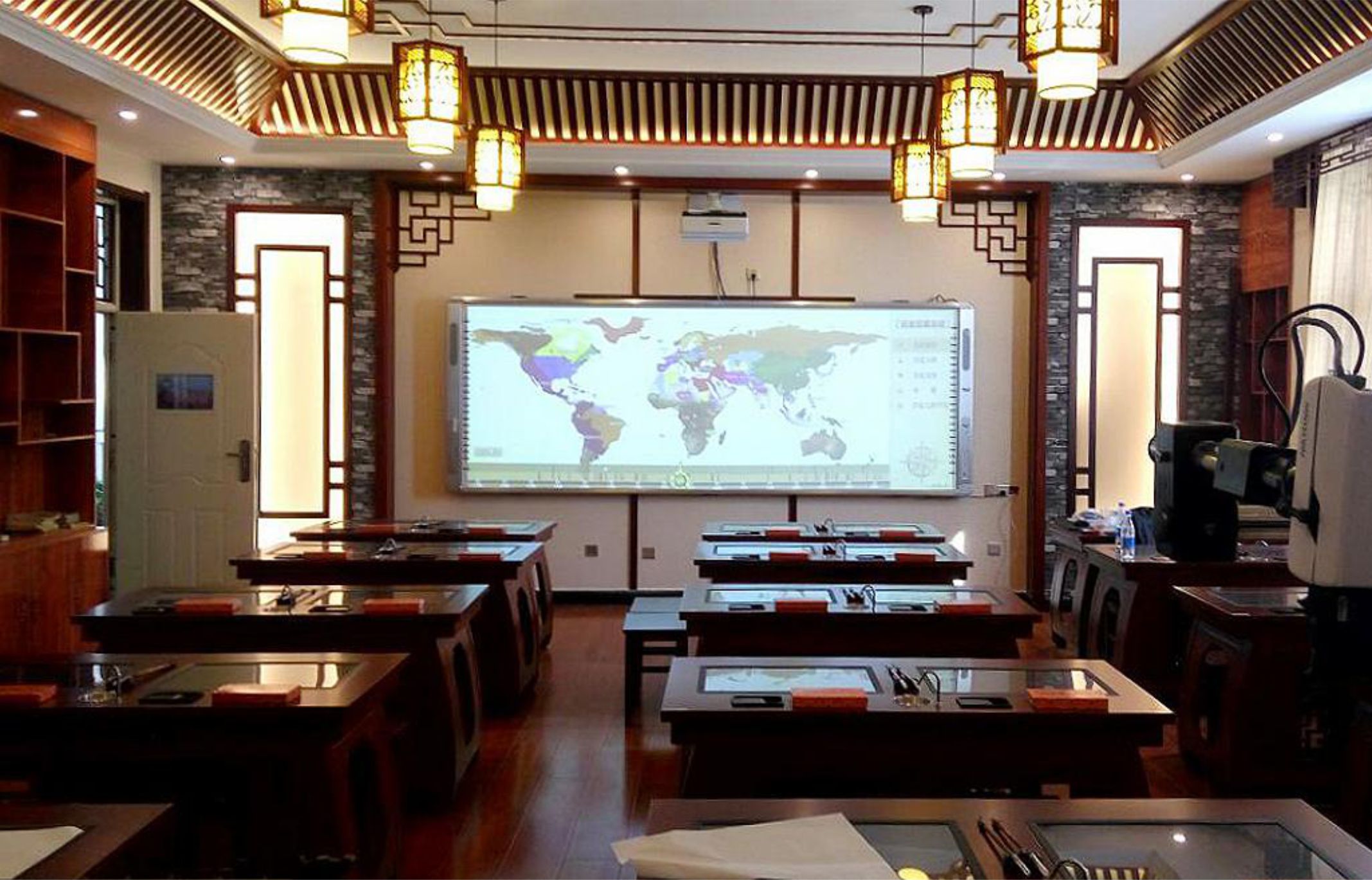 從走進(jìn)教室,博物架、仿古壁紙、古色古香的方格鏤空花雕隨處可見,文房四寶靜置于木質(zhì)長(zhǎng)桌上,長(zhǎng)桌玻璃鏡面內(nèi)置全息書法字庫(kù)、書法課件播放系統(tǒng)、字帖生成系統(tǒng)等,學(xué)生可以直接將宣紙鋪在桌上臨摹,即可練習(xí)書法。環(huán)顧周圍,你會(huì)看到各個(gè)時(shí)期的器物,如周朝的青銅方鼎、春秋時(shí)期的戰(zhàn)車、明清的仿瓷以及很多國(guó)學(xué)大師的經(jīng)典語錄,整間教室都充滿著靜謐,流淌著淡淡墨香。