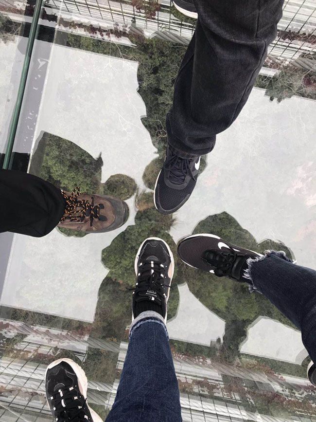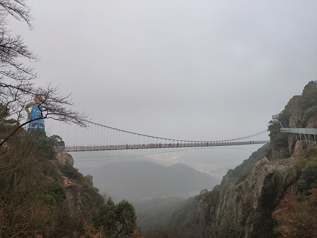 “飛龍玻璃橋”全長388米,垂直高度180米,橫跨馬仁奇峰太陽山與主峰之間,連接天梯玻璃棧道共同組成了一個高空體驗觀景勝地。從遠(yuǎn)處看,兩條巨龍盤踞在玻璃橋兩端,橋下萬株楠木,宛如一幅“飛龍?zhí)鞓蚩撮!钡慕^妙畫卷。