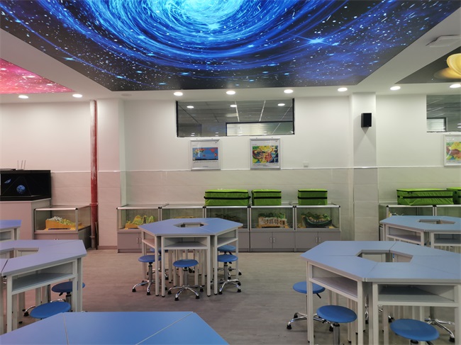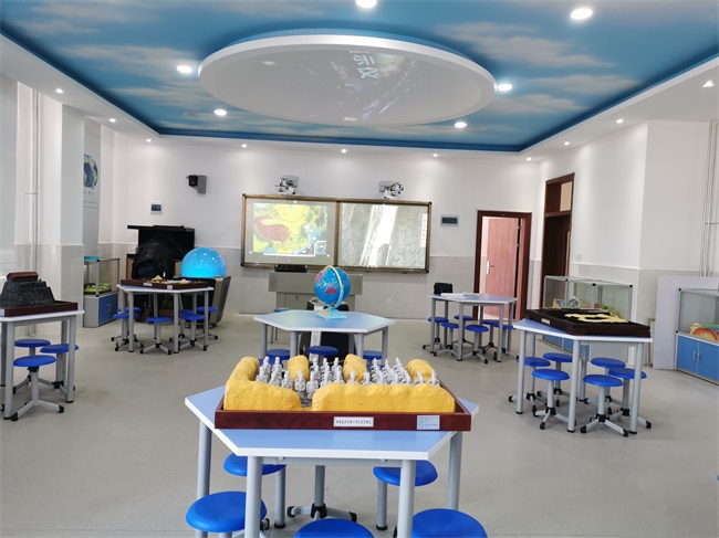 深邃的藍(lán)色、小組學(xué)習(xí)式的課桌椅以及四周的地理知識窗簾和地形地貌模型,羿飛地理專用教室一改傳統(tǒng)教室的設(shè)計(jì)布局,以更清新自由的形象展現(xiàn)在師生面前。