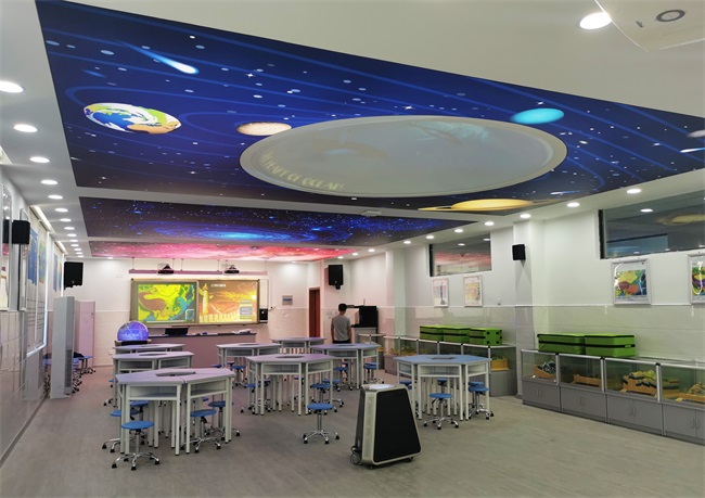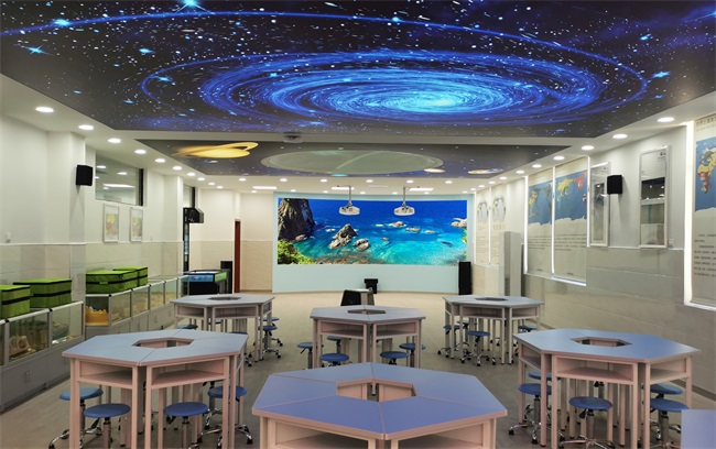 羿飛這間數(shù)字化地理專用教室配備了多媒體超半球互動球幕投影演示儀、數(shù)字立體地形、天文演示儀、環(huán)幕示教系統(tǒng)、AR地理沙盤、數(shù)字模型等教學(xué)設(shè)備聯(lián)動,為地理教學(xué)提供了一種更便利、更高效的方式。