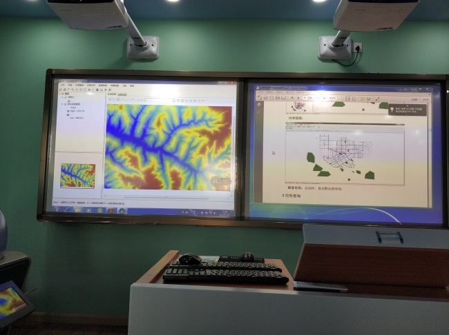 在羿飛數(shù)字化地理專用教室的前方,數(shù)字立體地形代替了傳統(tǒng)黑板居于正中央。這個(gè)集成了兩塊中國(guó)、世界立體地形圖的數(shù)字化教學(xué)設(shè)備,看得見(jiàn)的高低地勢(shì)走向,賦予學(xué)生一雙“真實(shí)之眼”,讓學(xué)生更立體直觀的認(rèn)識(shí)世界。