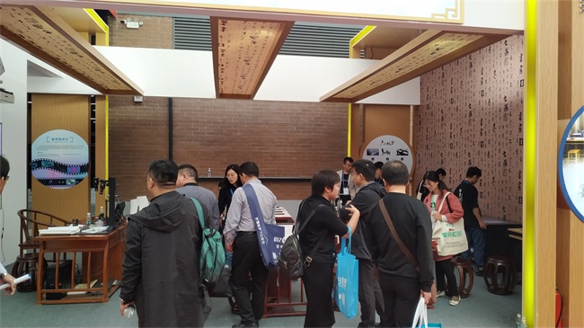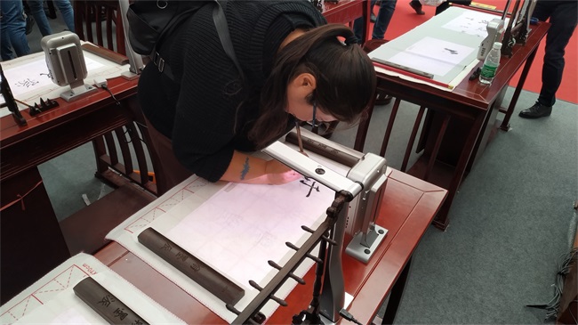 在展會(huì)現(xiàn)場(chǎng),參觀者在翰墨派書法教學(xué)系統(tǒng)的指導(dǎo)下完成一幅書法寫作,還能領(lǐng)取一份精美禮品,大家躍躍欲試,活動(dòng)參與者眾多,親自感受了一把揮毫潑墨的樂趣。