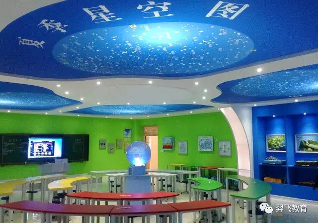 地理教室以藍(lán)、綠、白為主色調(diào),教室中心放置數(shù)字星球,以之為核心,課桌設(shè)計(jì)成圓弧形,圍繞數(shù)字星球一圈圈擺放。數(shù)字星球正上方是穹頂, 教室的天花板被分成了四個(gè)區(qū)域,繪制了春、夏、秋、冬四季星空?qǐng)D。此外,教室四周還布置了三維地圖、地理模型等,置身其中就像處在一個(gè)“地理小世界”,河南省某市教育裝備處的主任坦言:“其他教室都是用三五分鐘參觀一下,而一進(jìn)地理教室大家都被觸動(dòng)了,索性就當(dāng)了回學(xué)生聽(tīng)了一節(jié)課”。
