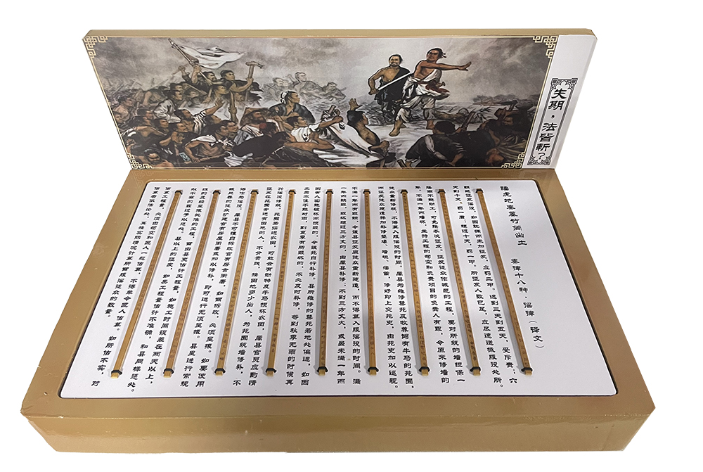 我司產(chǎn)品秦律竹簡演示套裝選取睡虎地秦墓竹簡中《秦律·徭律》一章,嚴(yán)格按照秦簡規(guī)格與體例進(jìn)行編撰鐫刻,務(wù)求保有其歷史滄桑韻味。演示套裝通過新中國時期出土史料,對兩千年來奉為圭臬的《史記·陳涉世家》中“失期,法皆斬”的秦末大起義原因提出質(zhì)詢,打破對秦代律法森嚴(yán)殘酷的固有印象,以期能夠激發(fā)學(xué)生獨(dú)立思考能力,并培育出“不唯上、不唯書、只唯實”的歷史探究精神。